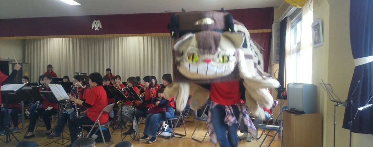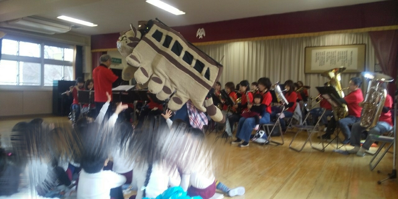 続いて演奏した勇気100%では、忍たまが登場!なんとPTAの方々が忍たまに扮して子どもたちに折り紙の手裏剣を配ってくださいました!