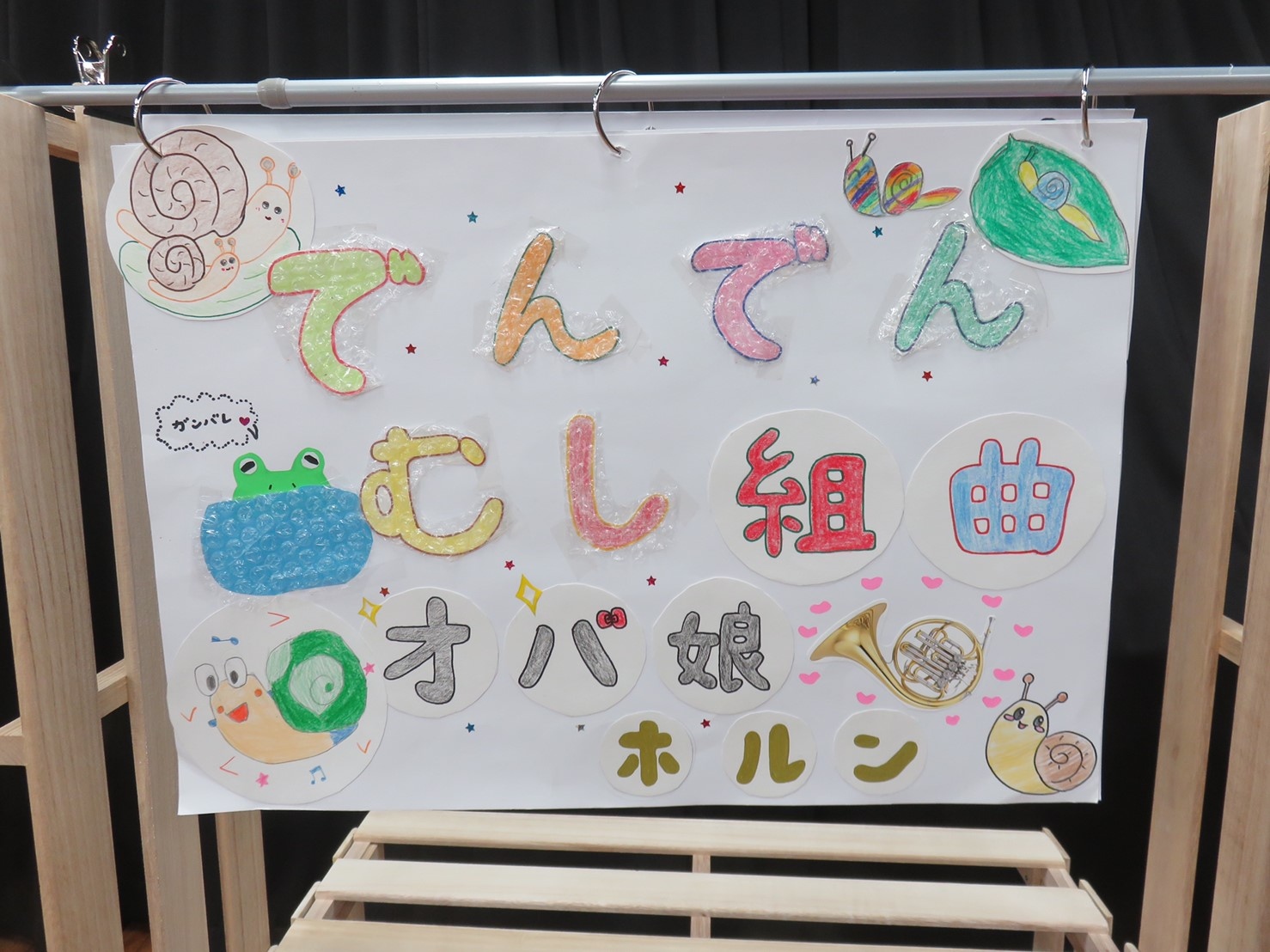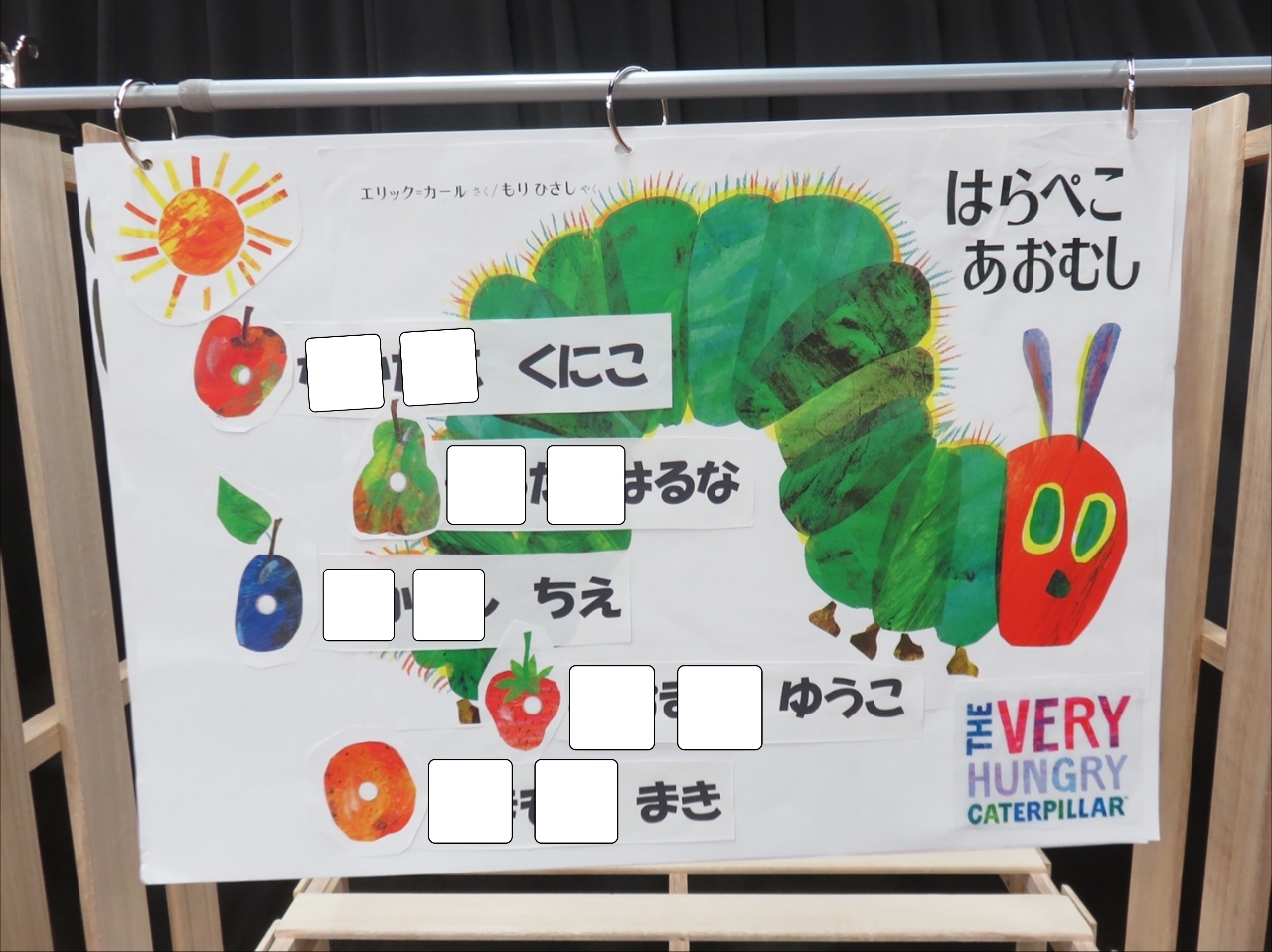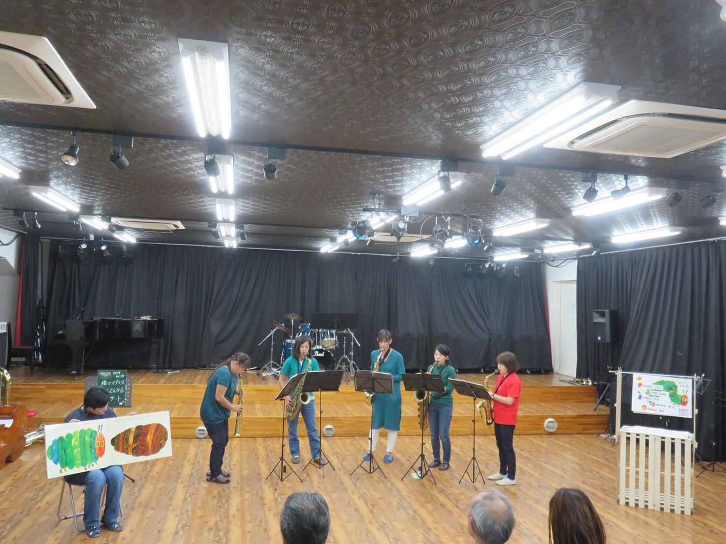 子どもたちに大人気はらぺこあおむし。なんと曲もあるんですよ♪ もともと管楽器五重奏だった譜面をサックス用に書き替えて挑戦!大型絵本も登場!絵本の世界へ引き込まれました〜