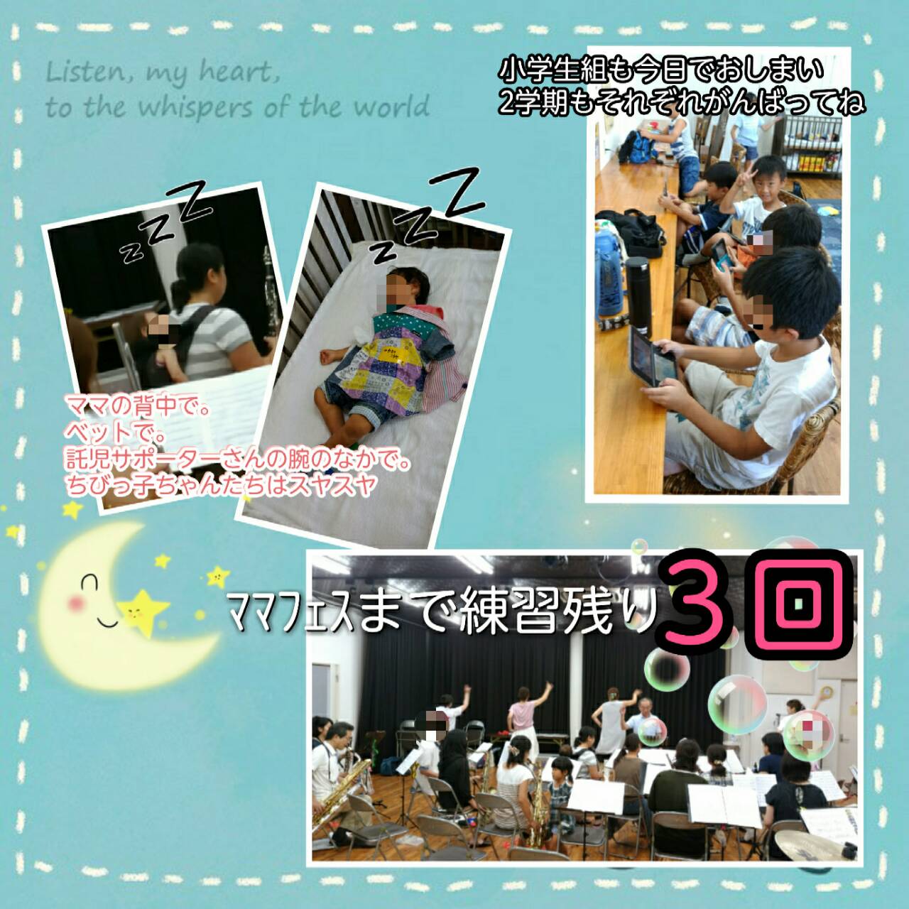 ママフェスまで残りの練習回数も少なくなってきました。またまだ曲は仕上がっていません。